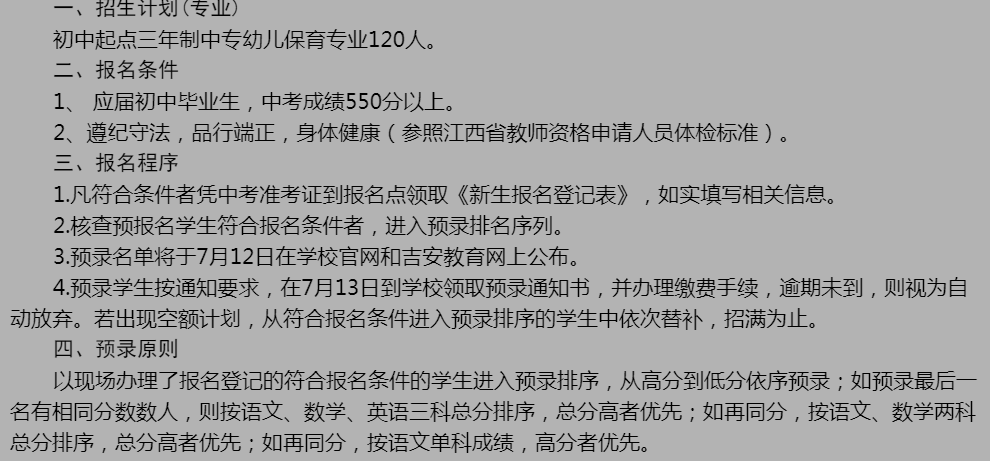 学校坚持“立足吉安,致力教育,服务乡村”的办学方向。构建了县市教育主管部门、师范学校、小学(幼儿园)“三位一体”的协同育人体系,围绕着吉安偏远乡村优秀师资的培养,实行“三定向”政策,取得了显著成效。一大批“下得去,留得住,教得好”的毕业生,扎根在吉安乡村教师岗位,正在为城乡教育均衡发展做出贡献。学校专业品牌突出,教风学风优良,文化底蕴深厚,培养模式成熟,就业前景广阔,是立志于教育事业优秀学子向往的地方,是吉安小学(幼儿园)教师的“摇篮”。